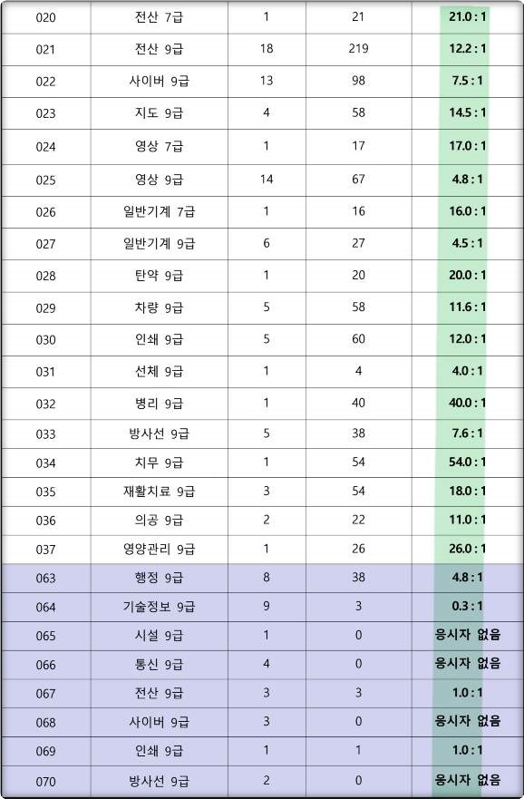 세 자릿수의 경쟁률을 보였던 수사 직렬과는 매우 상반되게 시설 9급, 통신 9급, 사이버 9급, 방사선 9급 직렬에는 아예 응시자가 없어서 경쟁률 자체가 없는 직렬도 있었습니다.