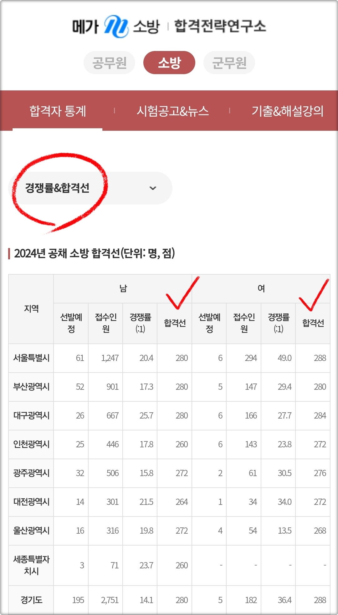 (메가소방 합격전략연구소 > 지역별 커트라인)