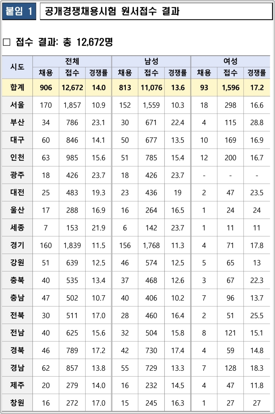 총 1,927명을 선발하는 이번시험은, 12,672명이 지원해 전체 경쟁률은 약 14대 1을 기록했습니다.