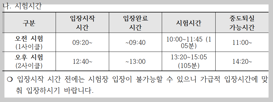 - 오전 시험: 09:20~09:40 입장 / 시험시간 10:00~11:45
