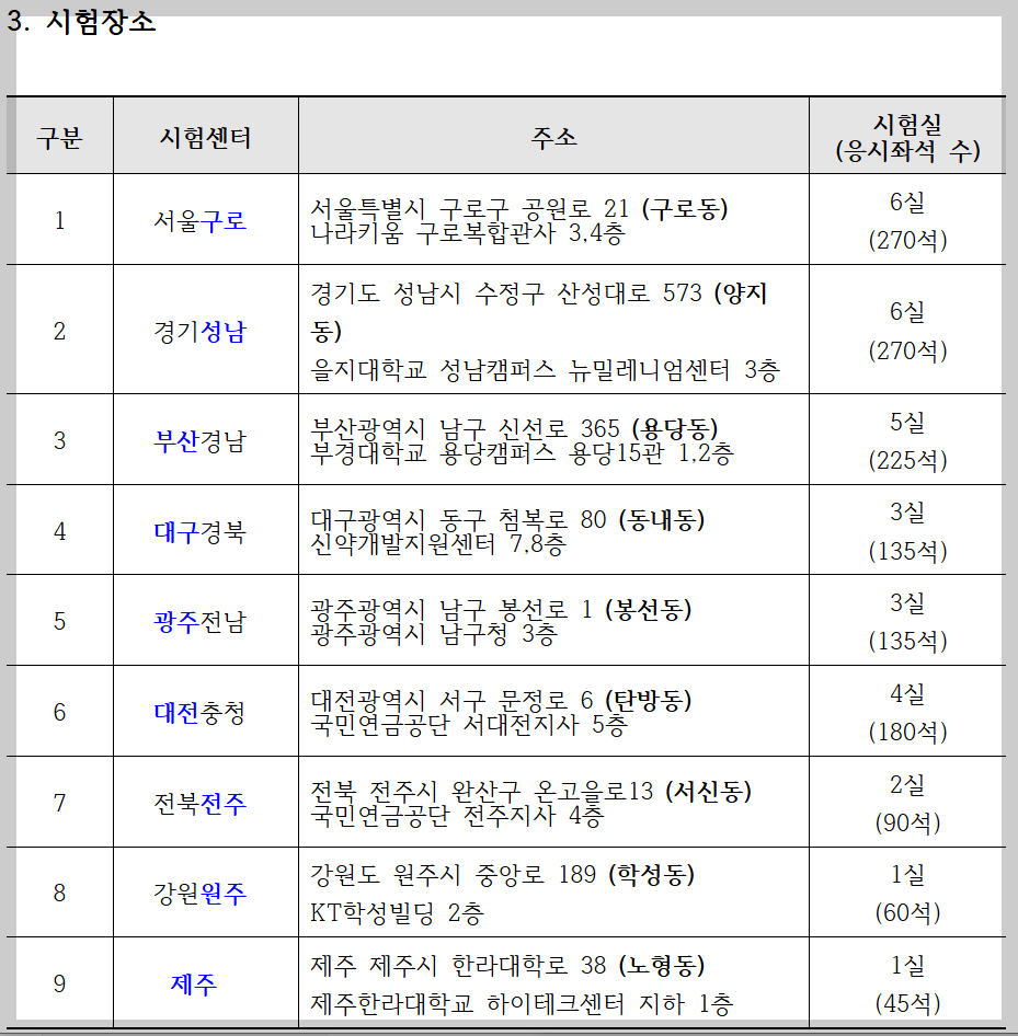 수도권부터 제주까지 고르게 분포돼 있긴한데, 아무래도 시험센터가 전국 9개뿐이라는 점은 아쉽습니다.