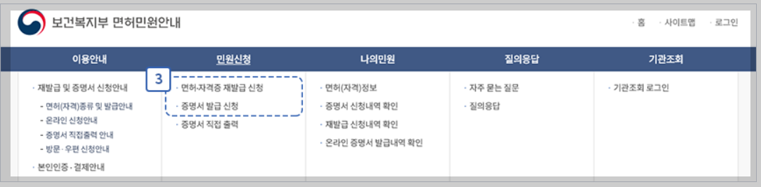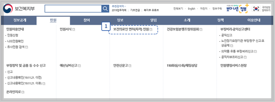 - 상단 메뉴에서 [민원 > 보건의료인 면허(자격) 민원] 선택