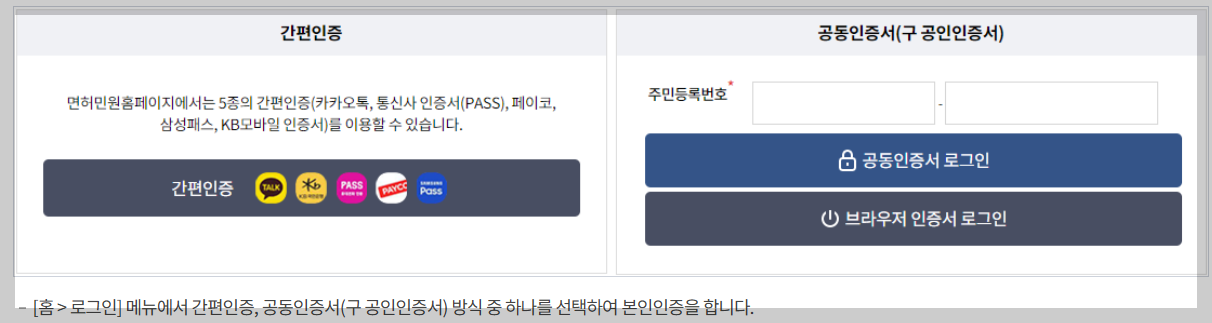 - 간편인증(카카오, PASS 등) 또는 공동인증서(구 공인인증서) 중 선택해서 로그인