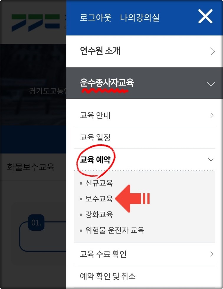 2️⃣ 오른쪽 상단의 ☰ 메뉴에서 [운수종사자교육]을 선택합니다.