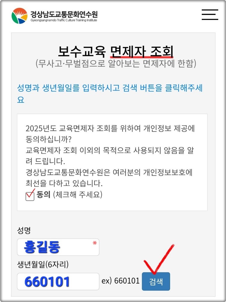 성함과 생년월일만 간단히 입력하면, 화물보수교육 면제유무를 확인하실 수 있습니다.