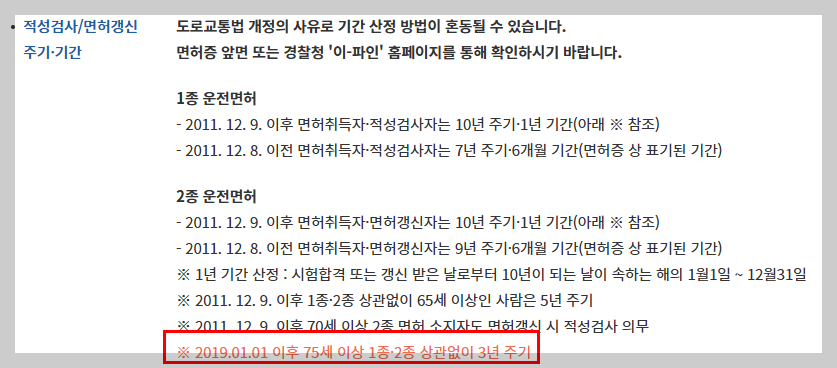 우선 2019년 1월 1일 이후부터는 75세 이상이면 1종이든 2종이든 상관없이 운전면허 갱신 주기가 3년으로 단축되었습니다.