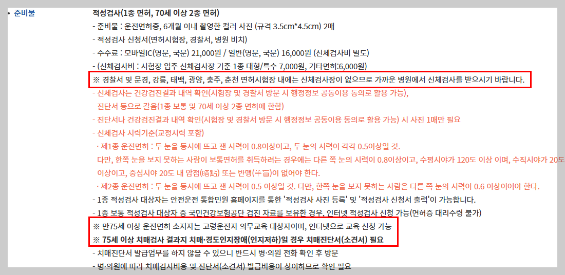 신체검사와 치매검사 같은 항목은 반드시 오프라인, 즉 병원이나 운전면허 시험장에서 받아야 해요.