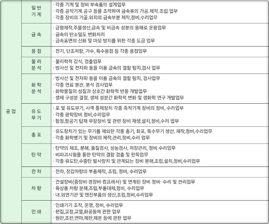 : 일반기계, 금속, 용접, 물리분석, 화학분석, 유도무기, 총포, 탄약, 전차, 차량, 인쇄 직렬 군무원 업무내용