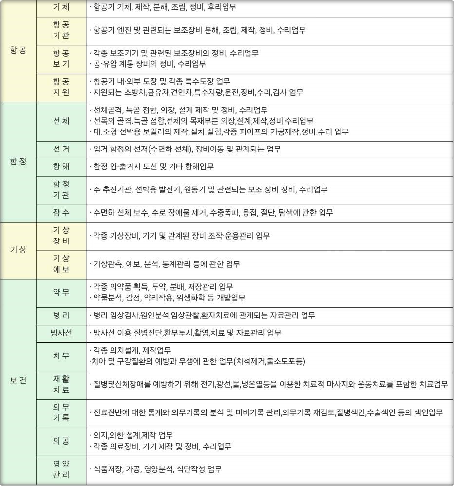: 기체, 항공기관, 항공보기, 항공지원, 선체, 선거, 항해, 함정기관, 잠수, 기상장비, 기상예보, 약무, 병리, 방사선, 치무, 재활치료, 의무기록, 의공, 영양관리직렬 군무원 업무내용