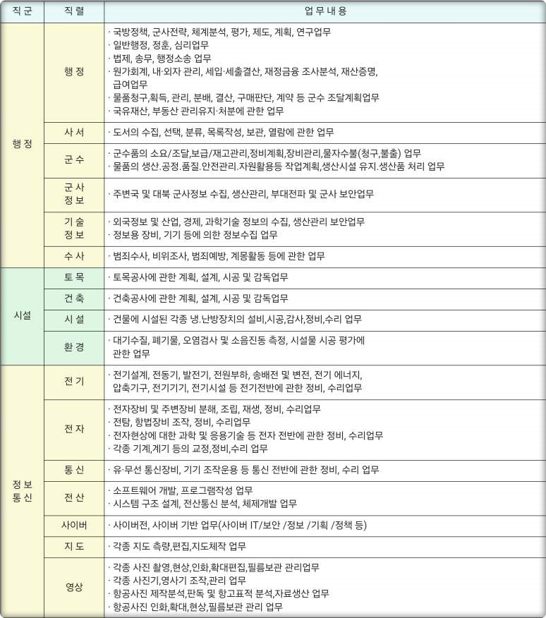 : 행정, 사서, 군수, 군사정보, 기술정보, 수사 직렬 군무원 업무내용