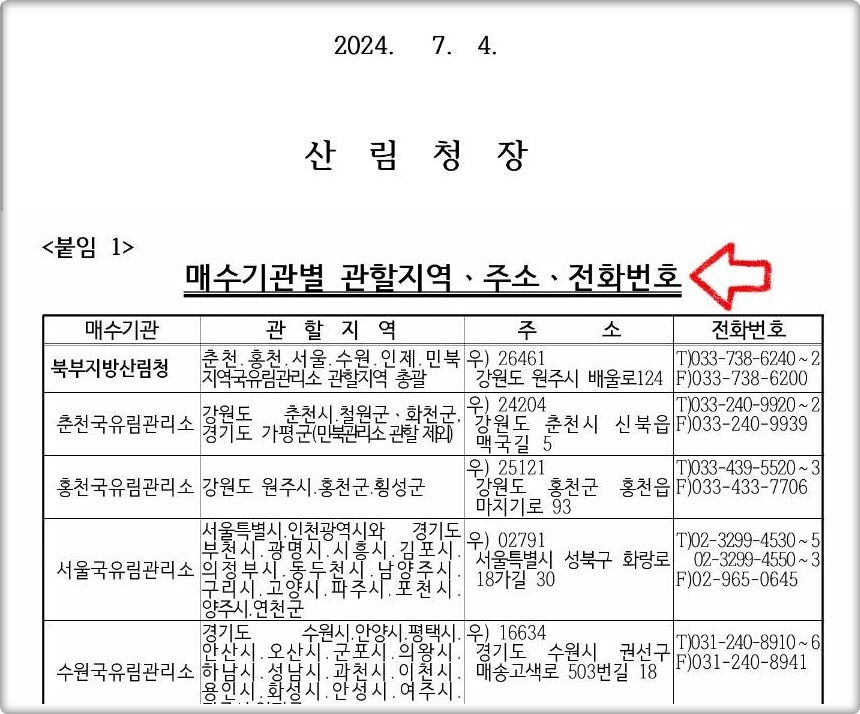 1️⃣ 먼저, 해당 산림이 위치한 행정구역을 관할하는 국유림관리소에서 "분할지급형 사유림매수제도"관련 사전 상담을 받아야 합니다.