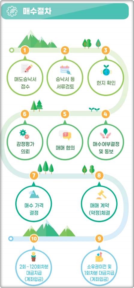 이 외에도 세부적인 매수 조건을 살펴보아야 하며, 매도를 희망하는 산주는 산림이 위치한 행정구역의 국유림관리소에 직접 문의하여 상담을 진행하는 것이 좋습니다.
