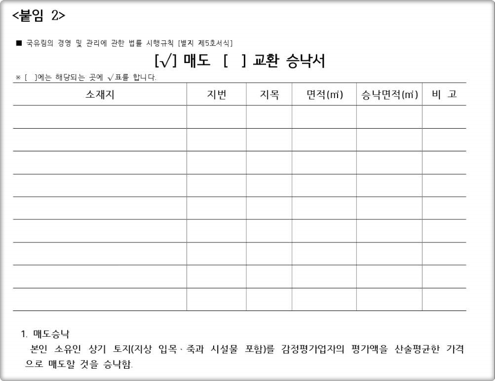 국유림 관리소와 먼저 상담 후 매도승낙서를 제출해야 신청절차를 진행할 수 있습니다.
