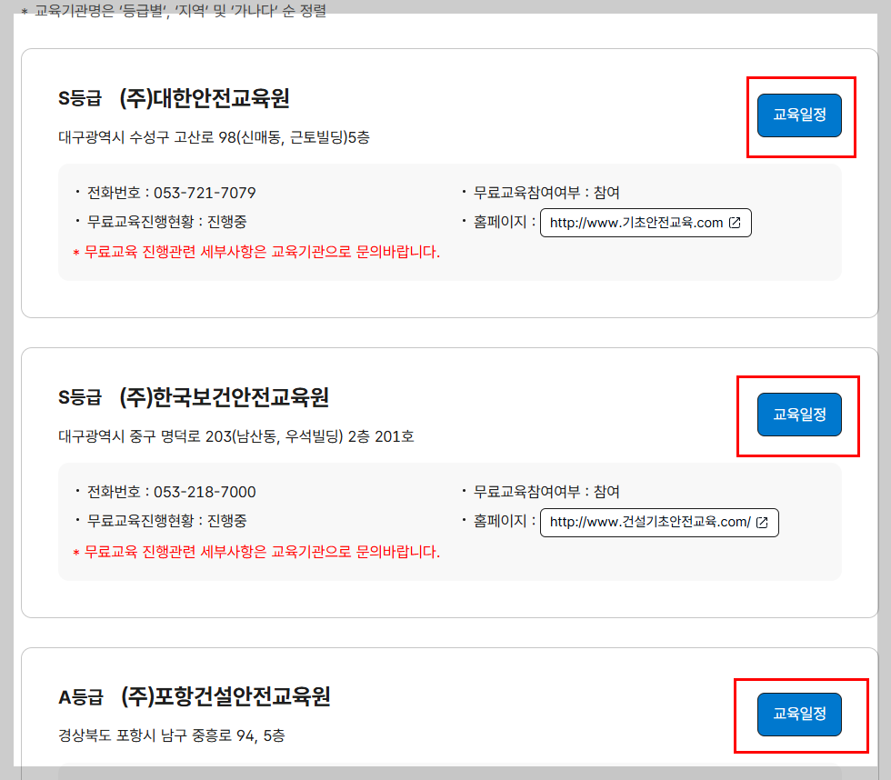 예를 들어, 대구 수성구에 위치한 (주)대한안전교육원은 S등급으로 등록돼 있고, 조건에 부합한다면 무료교육 참여도 가능합니다.