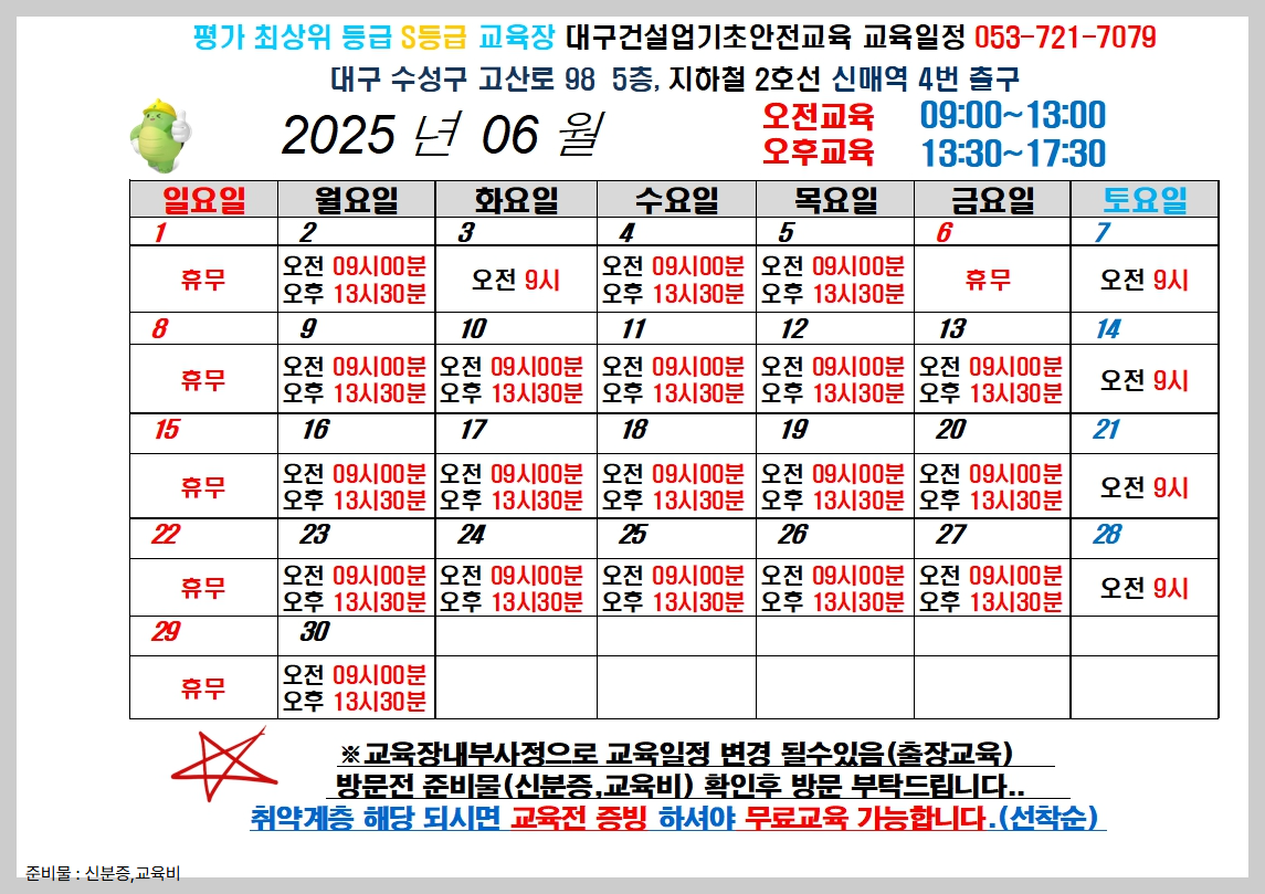 다만, 일요일과 공휴일(일부 월요일)은 휴무이며, 교육장 내부 사정이나 출장교육 등의 이유로 일정이 변경될 수 있으므로 사전 확인이 필요합니다.