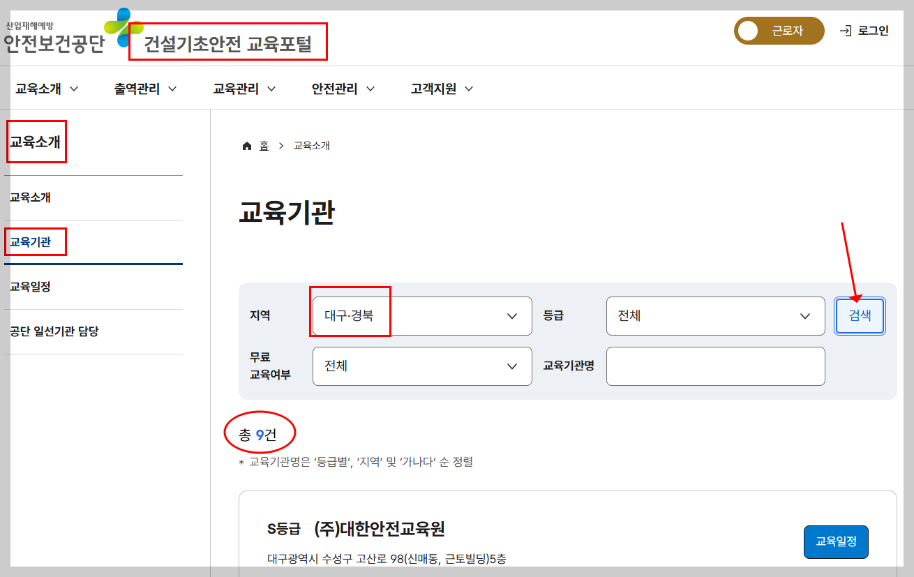 대구내 전체 교육기관의 기초안전보건교육일정을 확인하고 싶은 경우에는 다음과 같은 방법으로 확인하실 수 있어요.