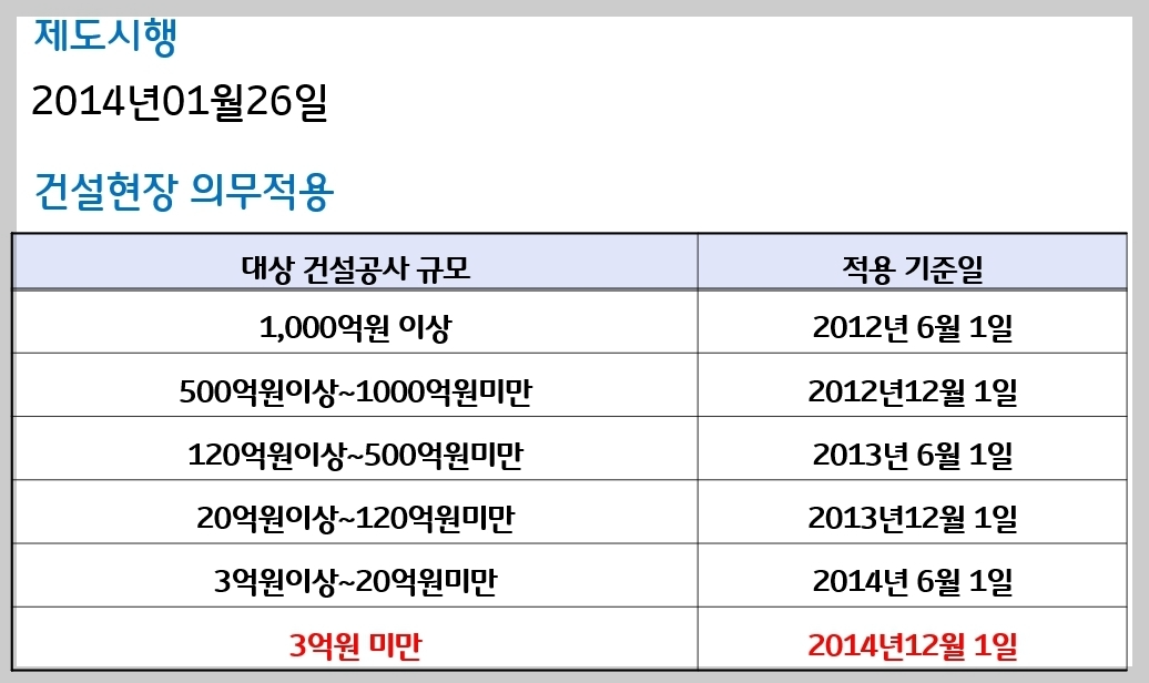 첨부된 표처럼, 건설공사 규모에 따라 적용 시점이 조금씩 달랐지만 2014년 12월 1일부터는 3억 원 미만 소규모 공사 현장도 적용 대상에 포함되면서 사실상 대부분의 건설현장에 기초안전보건교육 의무가 전면 확대됐다고 보시면 됩니다.