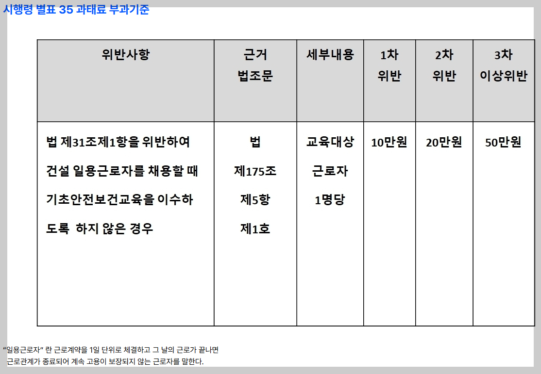 고용한 사업주(도급인 또는 하도급 사업주)에게 과태료가 부과됩니다. - 따라서 현장에 투입될 인력에 대해 교육 이수 여부를 미리 확인하고,