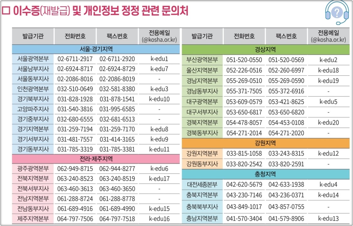 이럴 경우에는 공단 지역본부에 방문 또는 연락해서 새로운 이수증 발급을 신청하셔야 합니다.