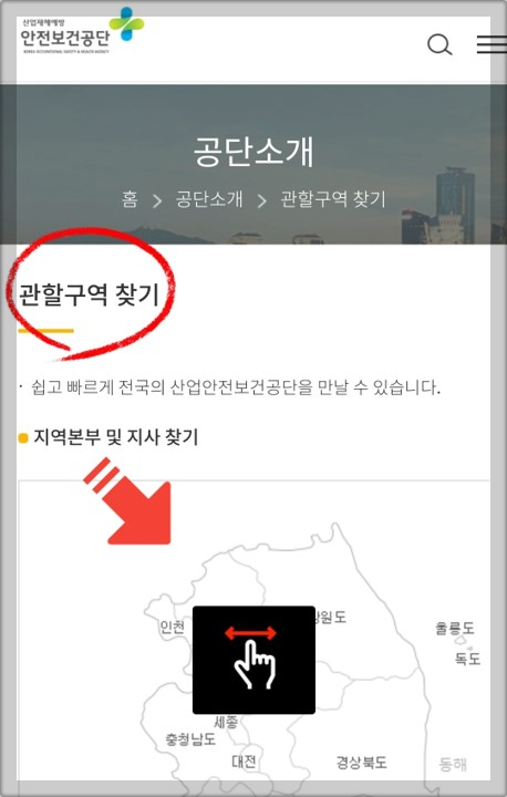 - 안전보건공단 홈페이지 → ‘관할 구역 찾기’ 메뉴 이용