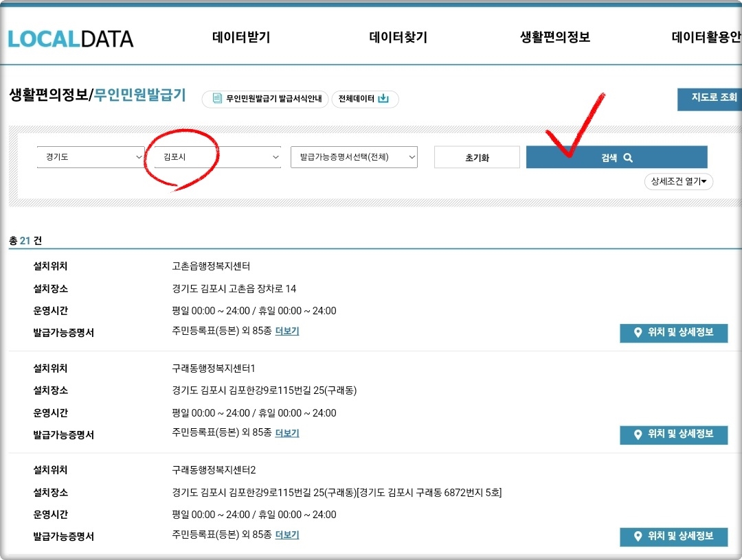 "김포시" 무인발급기 위치는 행정안전부에서 운영하는 '로컬데이터 포털'이 가장 잘 되어 있는 편인데요.