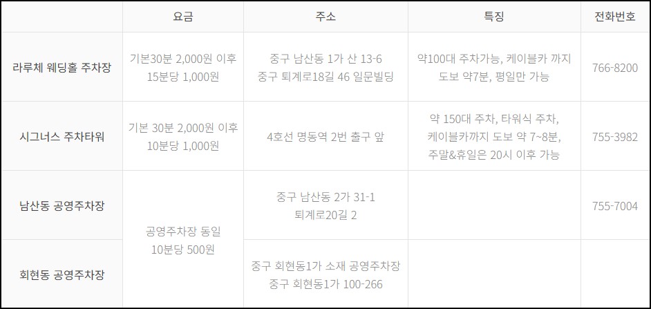 이 외에도 명동역 주변에 민영주차장이 있습니다. 남산 케이블카와 도보 15~19분 거리에 있는 민영주차장으로는 [엠마오 민영주차장], [밀리오레 민영주차장], [눈스퀘어 주차장]이 있습니다. (← 원하는 주차장 선택 시 해당정보 페이지로 이동합니다.)