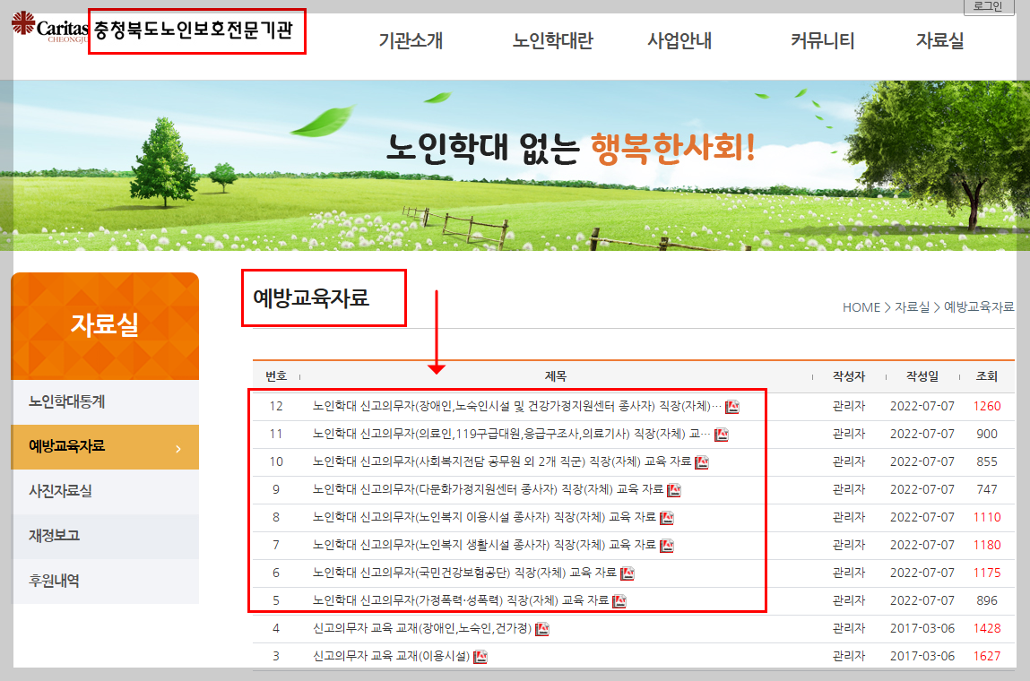 홈페이지 상단의 '노인학대예방 및 신고의무에 관한 교육' 메뉴 안에는 자체교육용 자료실이 따로 마련되어 있어요.
