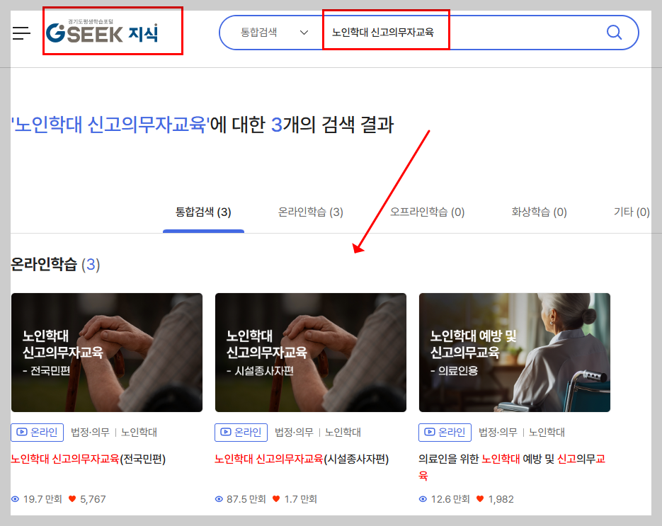 • 홈페이지 상단 검색창에서 “노인학대 신고의무자 교육”을 검색하면, 전국민편·시설종사자편·의료인편 등 다양한 강좌가 나와요.