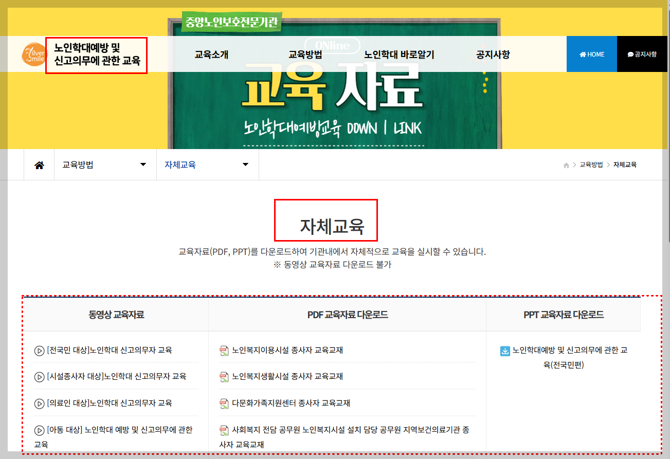 홈페이지 안에 ‘노인학대예방 및 신고의무에 관한 교육’ 메뉴가 따로 마련되어 있어서, 직군별로 맞춤형 PDF 교재와 동영상 강의를 볼 수 있습니다.