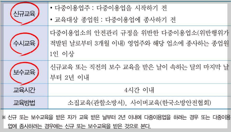 : 다중이용업주나 종업원이 그 해당연도에 소방안전관리자 강습교육이나 실무교육 또는 위험물안전관리자 교육을 받은 경우에는 소방안전교육을 받은 것으로 보기 때문에 다중이용업 교육을 수강하지 않아도 됩니다.