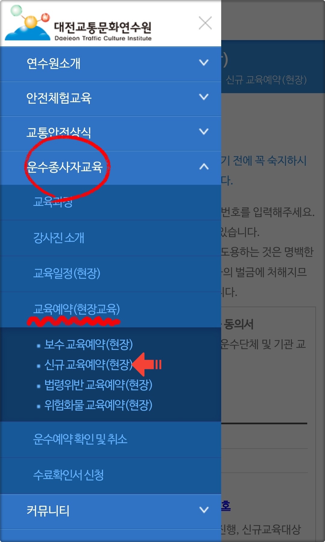 [대전교통문화연수원 홈페이지 → 운수종사자교육 → 교육예약(현장교육)] 메뉴로 들어가면 되는데, 신청할 때 실명 확인을 위해 이름과 주민등록번호를 입력해야 합니다.