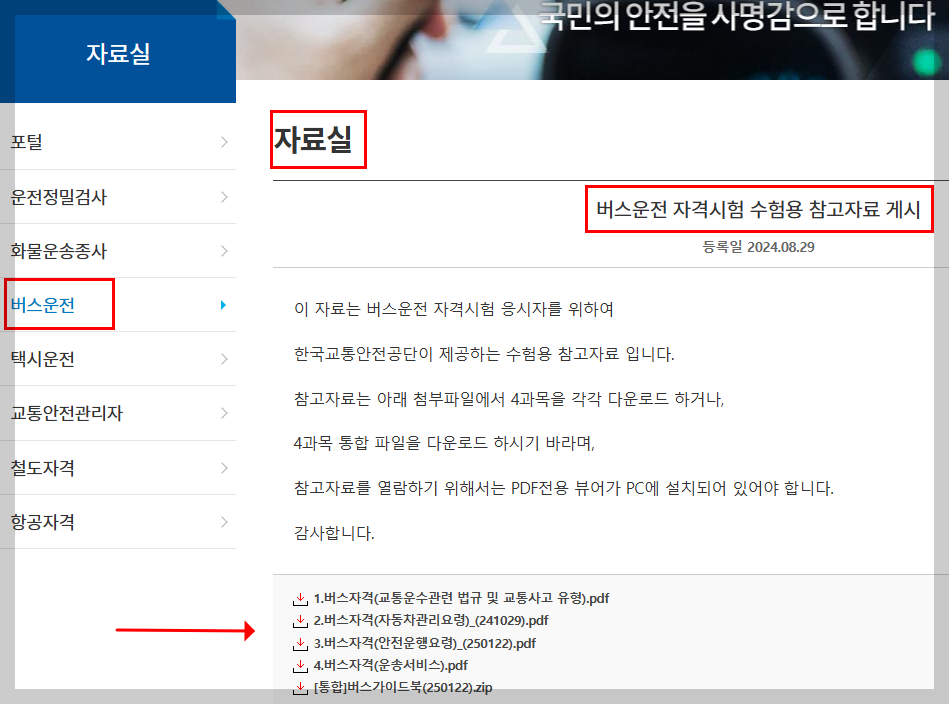 다행히 교통안전공단(TS국가자격시험 홈페이지)에서는 버스시험 필기 준비를 위한 공식 수험용 참고자료를 무료로 제공하고 있습니다.