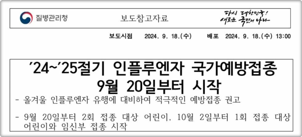 이번 독감 예방접종은 2024년 9월 20일부터 내년 4월 30일까지 진행되는데요.