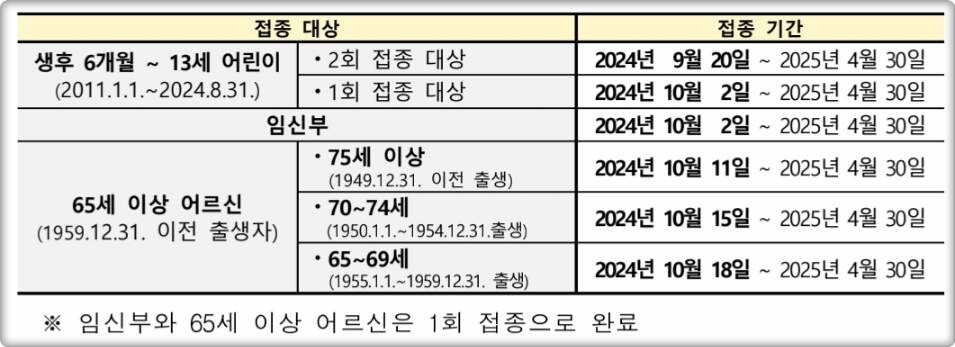 ✔️ 예방접종 기간: 2024년 10월 2일(수)부터 2025년 4월 30일(수)까지 접종이 가능합니다.