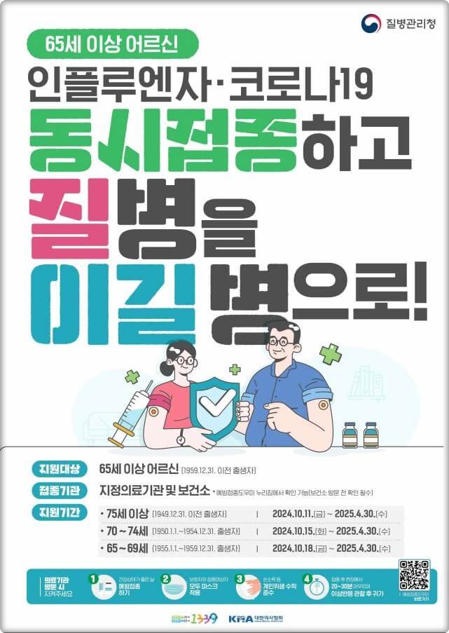 질병관리청은 65세 이상 어르신의 경우, 코로나19 예방접종과 독감 예방접종을 같은 날에 동시에 받을 것을 권장하고 있습니다.