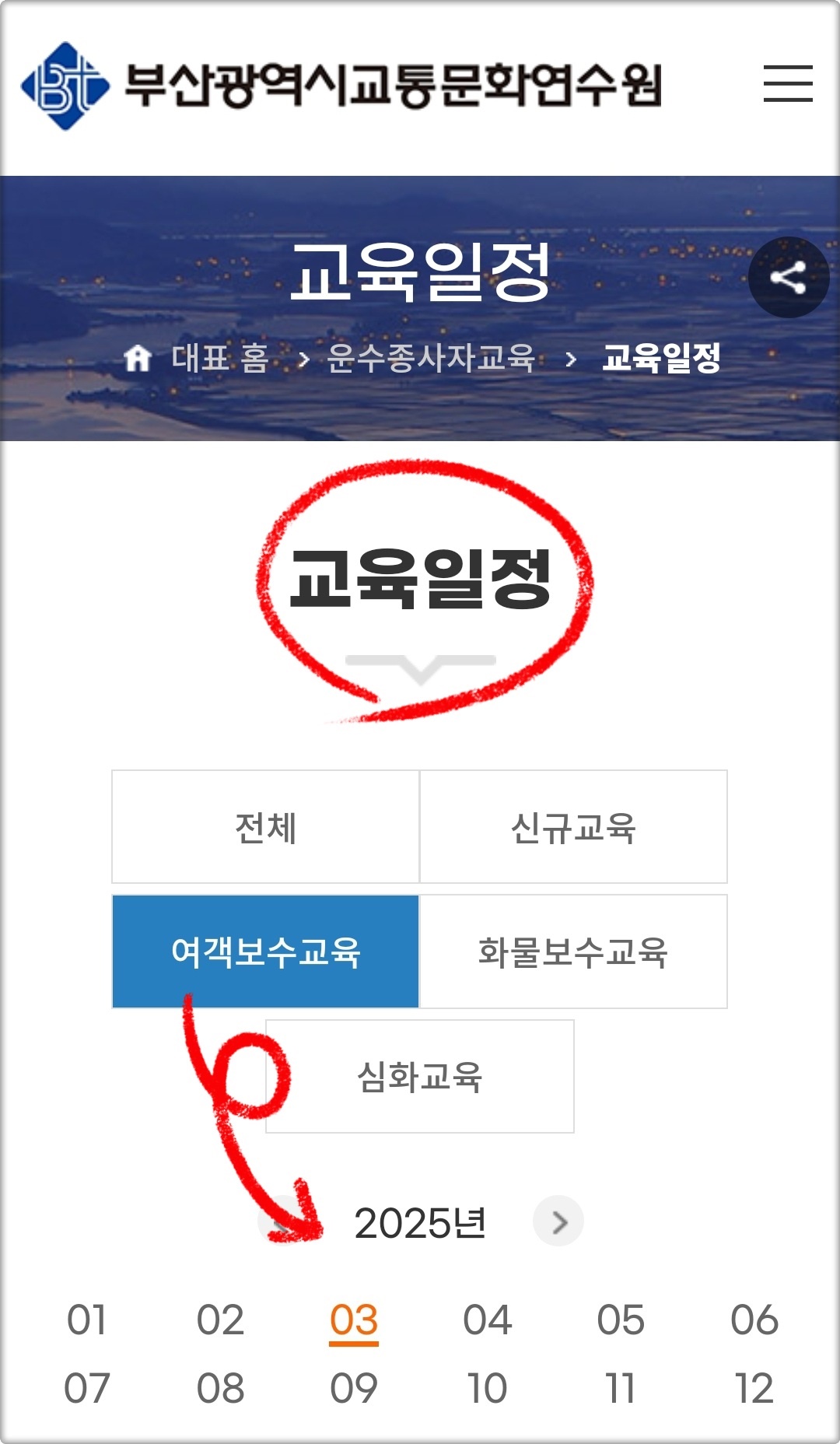 현재 부산광역시 교통연수원 홈페이지에는 2025년도 연간 보수교육 일정표가 이미 올라와 있는데요.