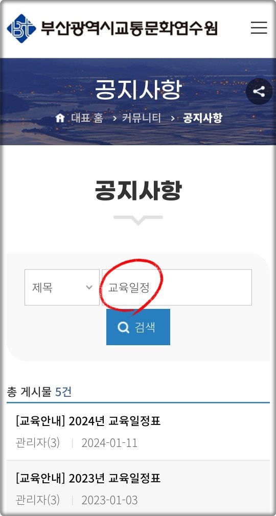 이번에도 비슷한 시기에 부산 교통문화연수원 홈페이지의 '공지사항'을 확인해보는 것이 가장 정확합니다.
