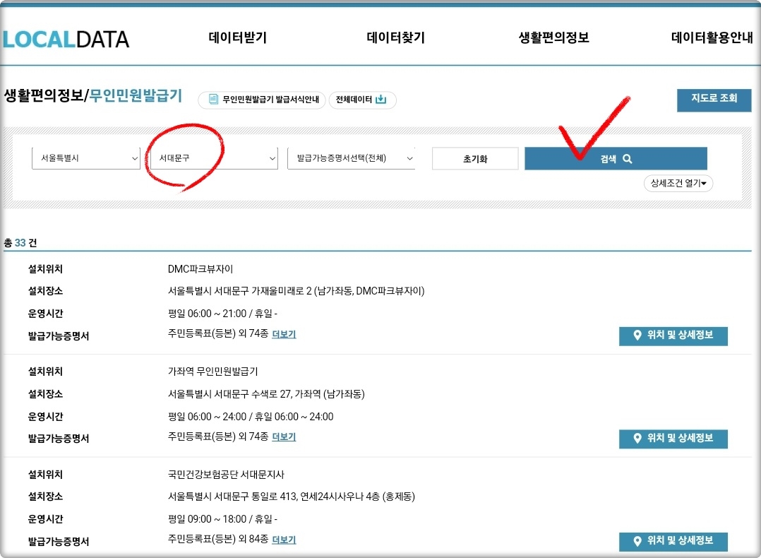 "서대문구" 무인발급기 위치는 행정안전부에서 운영하는 '로컬데이터 포털'이 가장 잘 되어 있는 편인데요.