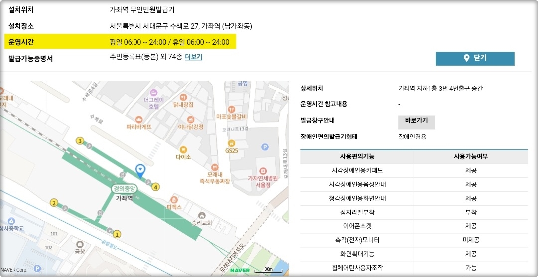 특히 서울 서대문구를 기준으로 무인민원발급기를 조회해보니, 설치 장소에 따라 운영시간이 제각각 다르다는 것을 확인할 수 있었는데요.