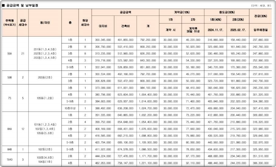 - 당첨자 선정: 한국부동산원 입주자 선정 프로그램을 통해 주택형별로 무작위 추첨으로 당첨자 선정 및 동·호수 배정이 이루어집니다.