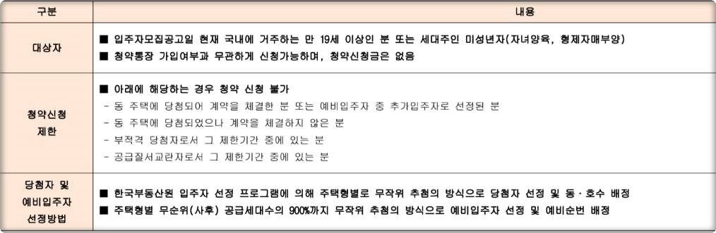 - 대상자: 국내 거주자 중 만 19세 이상인 분 또는 세대주인 미성년자(자녀양육, 형제자매부양)에게 공급됩니다.
