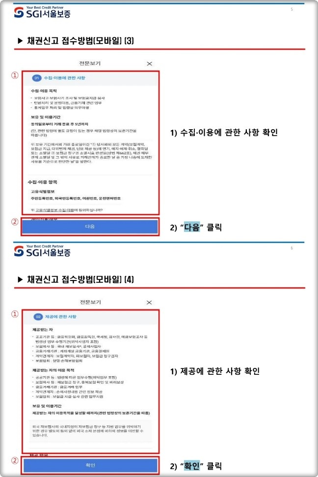 위의 모바일 채권신고 매뉴얼에는 단계별 이미지가 포함되어 있어 한눈에 이해하기 쉽고, 따라 하기 편리합니다.