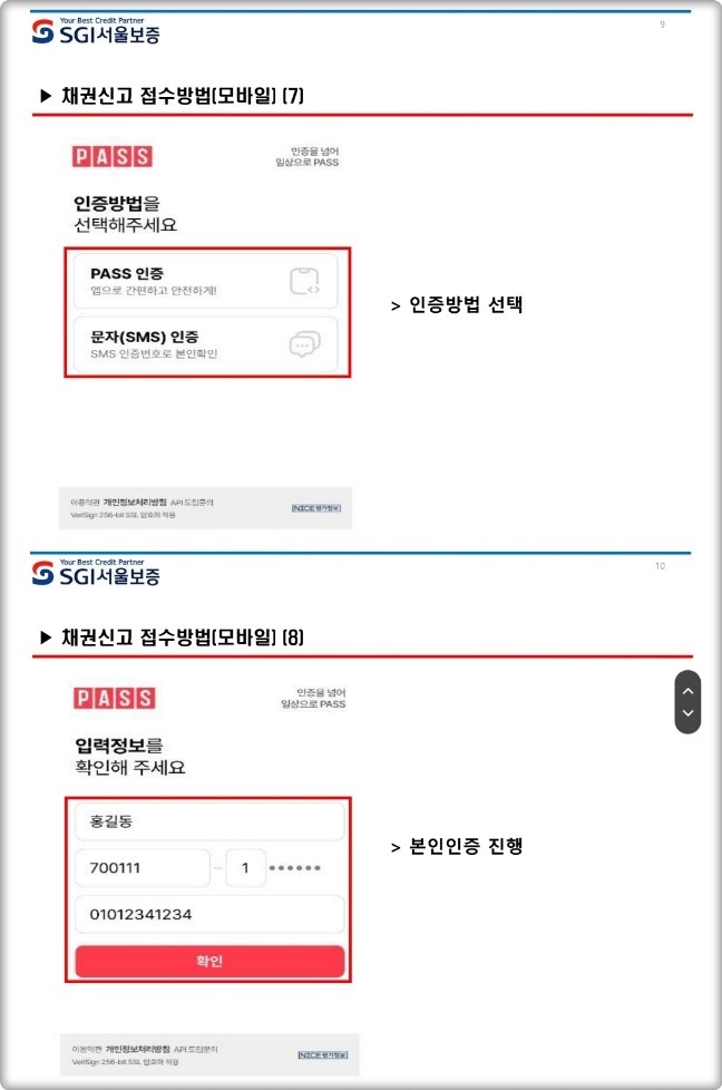 - 조회 방법: 채권신고 화면에서 휴대폰 본인확인 후 자동 조회가 가능합니다.