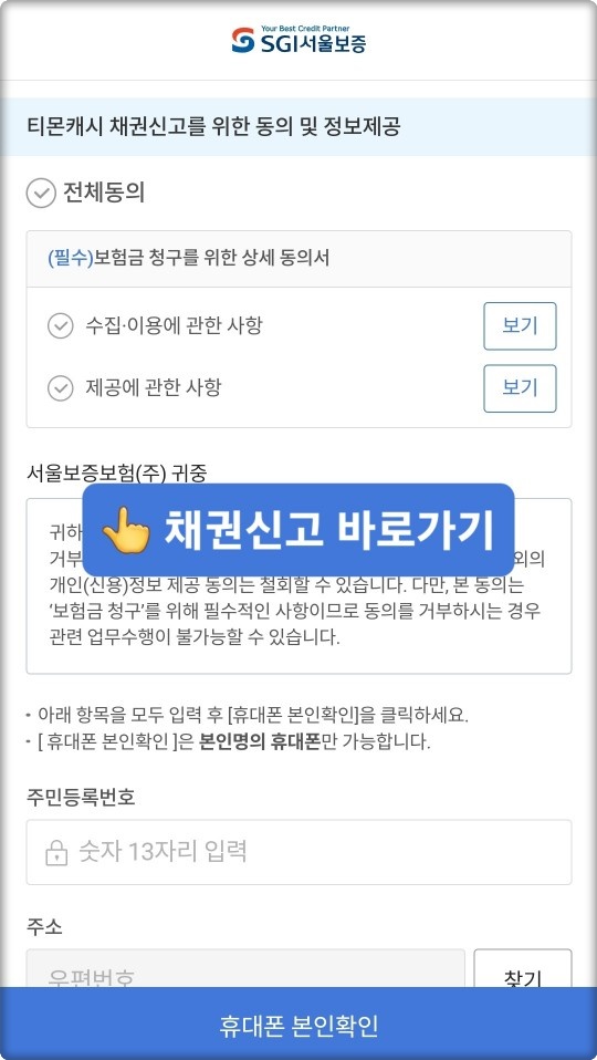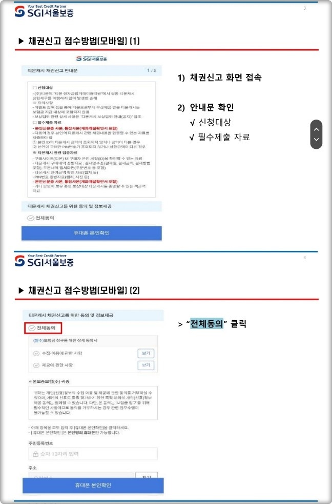 SGI 서울보증보험이 "티몬캐시"를 환불받지 못한 구매자들을 대상으로 환급신청(채권신고)을 받기 시작했습니다.
