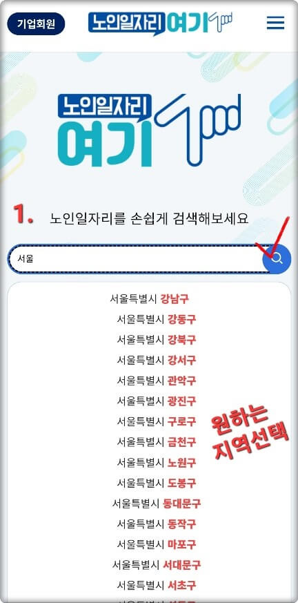 - 일자리를 구하고 싶은 지역을 입력한 뒤 돋보기 버튼을 눌러보세요.