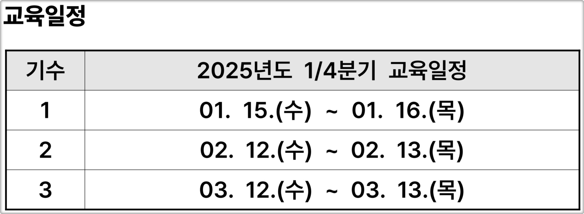 현재 2025년도 1월 일정은 모두 마감됐고, 가장 가까운 교육은 2월 12일 수요일부터 2월 13일 목요일까지 이틀 동안 진행됩니다.