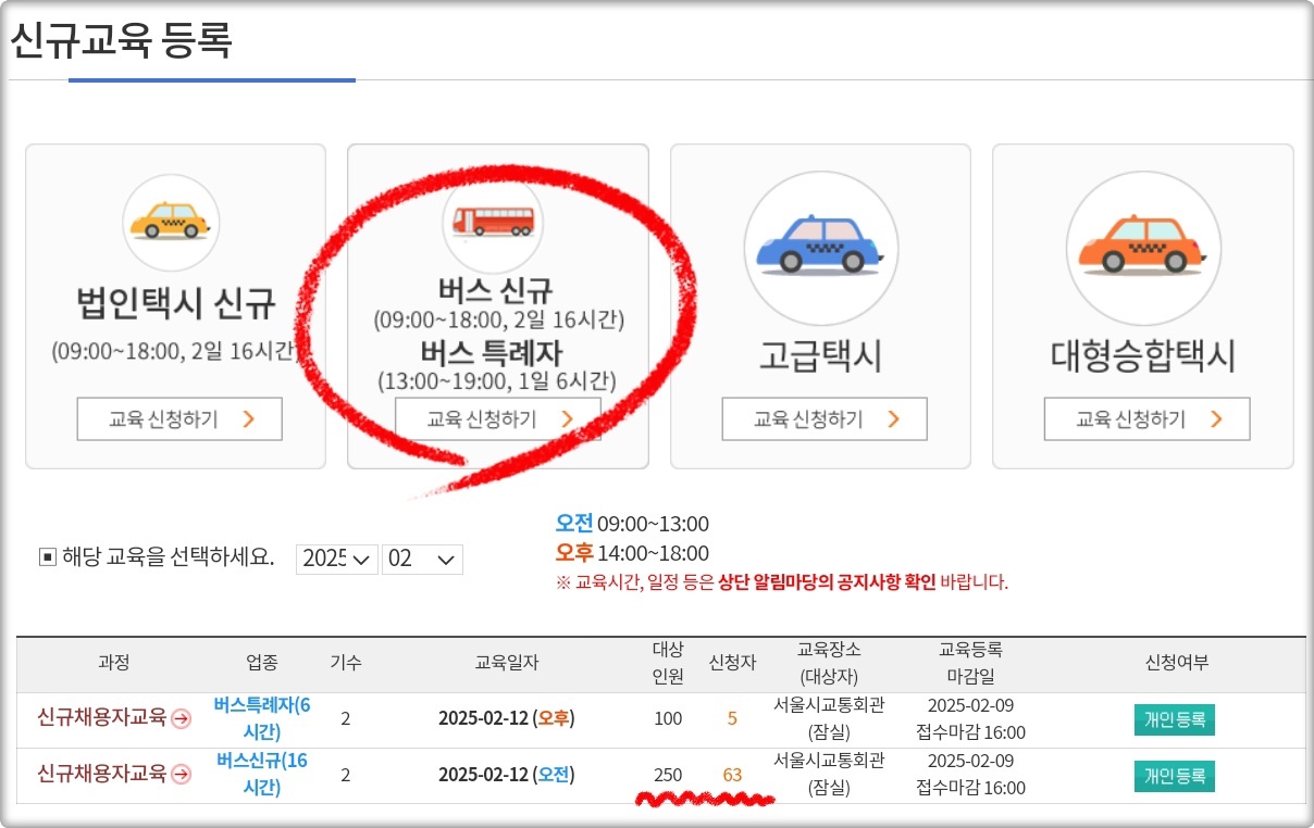 2025년도 버스 신규채용자 교육은 '신규 취업자'뿐만 아니라 '특례자 교육 대상자'도 포함되어 있어서,