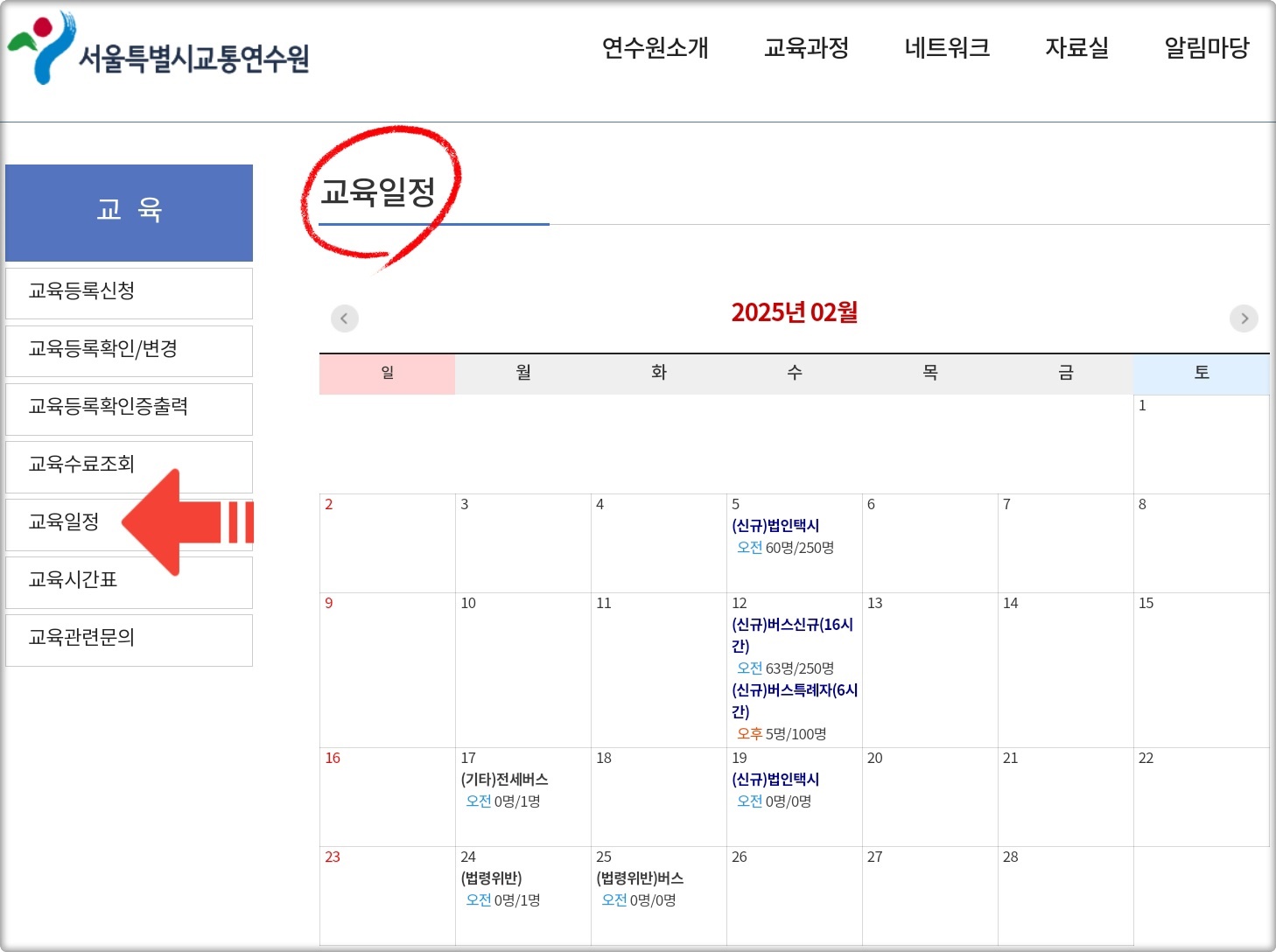 서울시 교통연수원의 '2025년도 1분기 신규교육 일정'은 이미 공지사항에 올라와 있는데요.