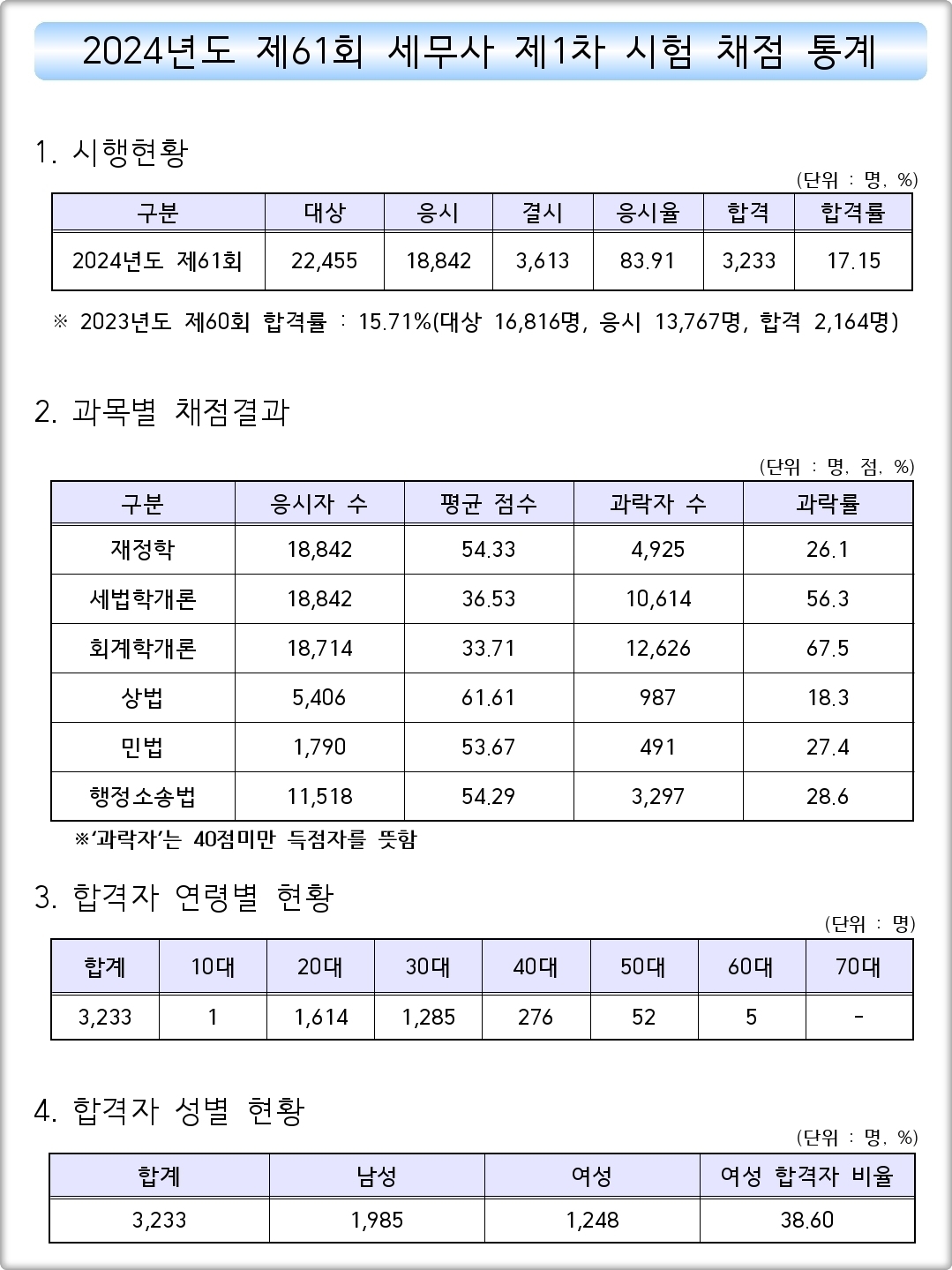 2024년도 제61회 세무사 1차시험에는 총 22,455명이 응시 대상이었고, 이 중 18,842명이 실제 시험에 응시해 3,233명이 합격했습니다.