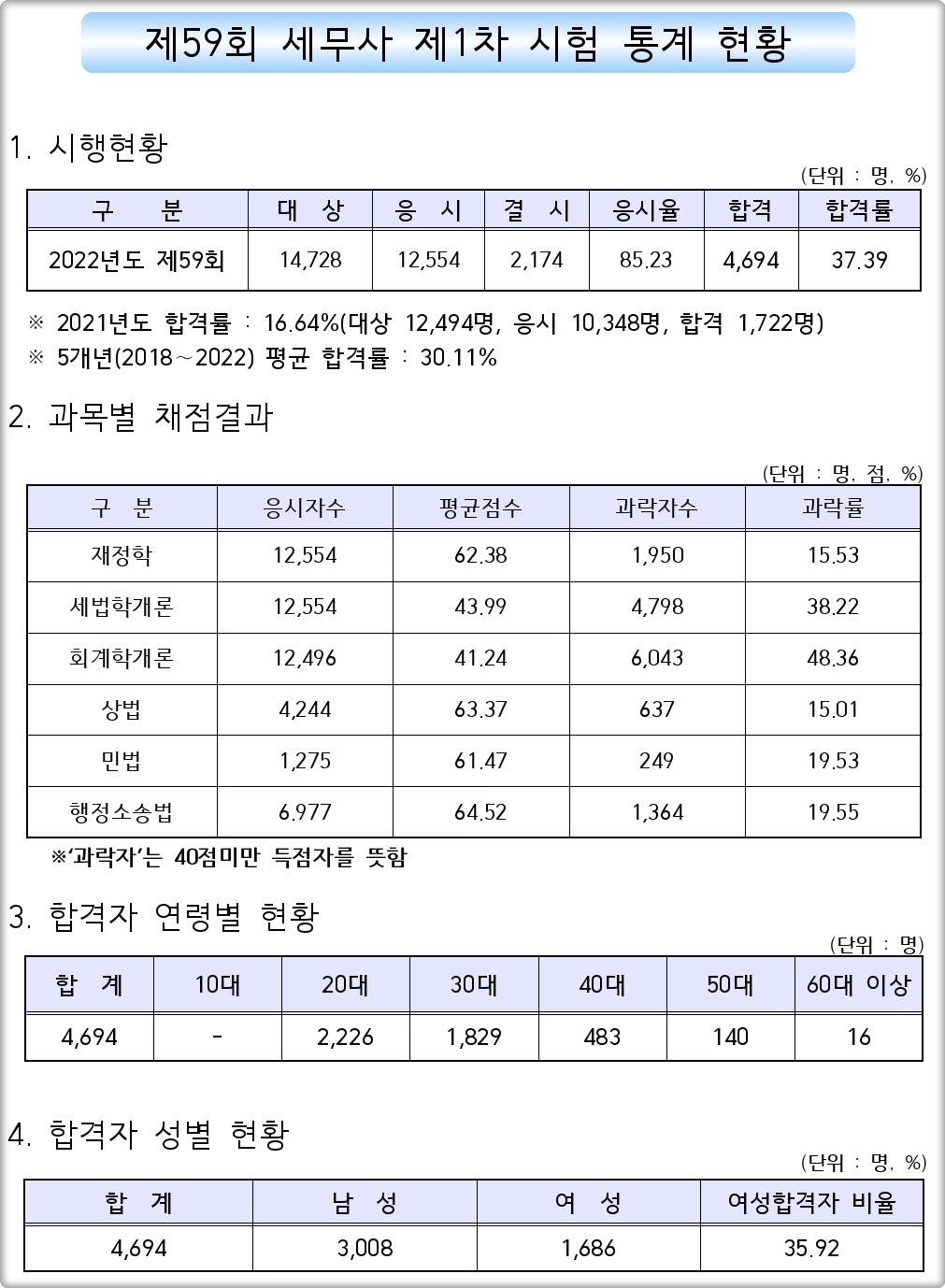 2022년도에 시행된 제59회 세무사 1차시험 합격 현황입니다.